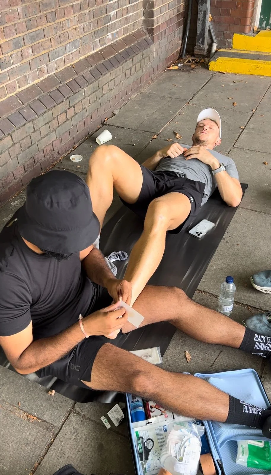 Day 11: The last Dance, Central line 92km! We started with routine blister management and a soft tissue routine to get the legs ready. Jonny was off to a steady midnight start, powering to Stratford in good shape. However, that's when the wheels started to come off. As we navigated through the stations in Ilford and Essex, Jonny’s left quad had taken a turn for the worst. Each step progressively got worse and forced Jonny into a painful shuffle. We taped to compress the quad and followed this with long pit stops to get into the quads and get them firing. Thankfully, this worked a miracle, and we were able to make it across to Epping. The hour drive to West Ruislip was not helpful as the legs began to cease up again. There were a few more pit stops to manage the quads, as well as taking every traffic light opportunity to dig a fist or elbow into the legs.